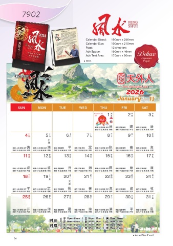 7902 Calendar Stand: 190mm x 256mm Calendar Size: 190mm x 210mm Page: 13 sheeters Adv Space: 190mm x 46mm Deluxe Adv Text Area: 170mm x 30mm Premium Paper Back New Year' s Day ݩ୴ 2026 Actual Size (Front) 34